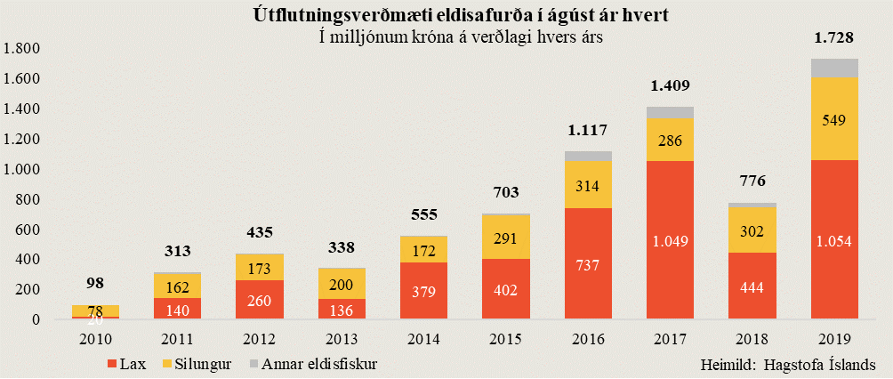 Útflutningsverðmæti eldisafurða nam um 1.728 milljónum króna í ágúst samkvæmt tölum sem Hagstofan birti í morgun. Þetta er mikil aukning frá sama mánuði í fyrra, eða sem nemur 123% og hefur útflutningsverðmæti eldisafurða aldrei verið meira í ágústmánuði. Gengi krónunnar var að jafnaði 10% veikara í ágúst síðastliðnum en í sama mánuði í fyrra miðað við gengisvísitölu krónunnar. Er því um að ræða tvöföldun í verðmætum í erlendri mynt. Í tonnum talið jókst útflutningur á eldisafurðum um 95%, en alls voru flutt út 1.764 tonn af eldisafurðum í ágúst samanborið við 906 tonn í sama mánuði í fyrra.