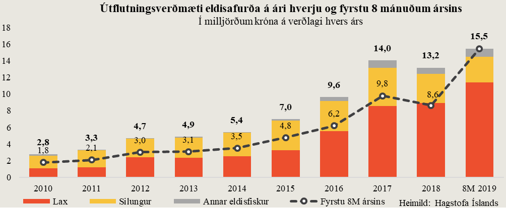 Á fyrstu 8 mánuðum ársins nemur útflutningsverðmæti eldisafurða um 15,5 milljörðum króna. Það er 79% aukning í krónum talið á milli ára, en á sama tímabili í fyrra var verðmæti eldisafurða komið upp í rúma 8,6 milljarða króna. Að teknu tilliti til gengisáhrifa nemur aukningin 60% og er það stóraukið eldi á laxi sem skýrir þessa aukningu eins og myndin hér fyrir neðan ber með sér. Á henni sést jafnframt að útflutningsverðmæti eldisafurða fyrstu átta mánuði ársins, er nú þegar orðið mun meira en það hefur áður verið á heilu ári. Með sama áframhaldi stefnir í að verðmæti útfluttra eldisafurða verði í kringum 24 milljarða króna í ár.