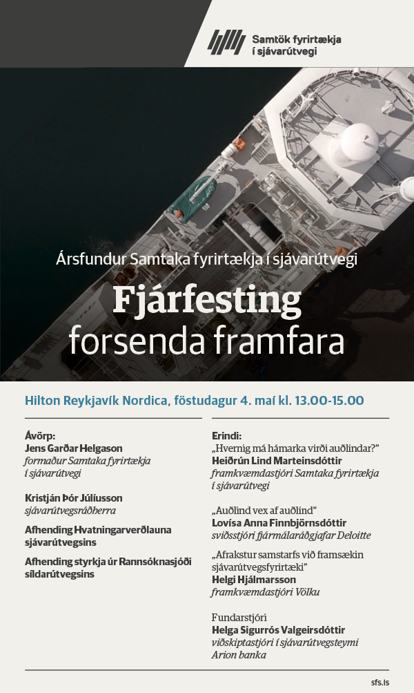 Samtök fyrirtækja í sjávarútvegi halda ársfund á Hilton Nordica Reykjavík dagana 3. - 4. maí. Yfirskrift fundarins er "Fjárfesting - forsenda framfara".