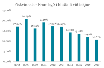 Frá árinu 1997 hefur launakostnaður fiskvinnslufyrirtækja á föstu verðlagi hækkað, þrátt fyrir rúmlega 64% fækkun starfsmanna í aðal- eða aukastarfi við vinnslu sjávarafurða. Þróunin hefur verið sérstaklega áberandi frá árinu 2008. Á tímabilinu 2008-2017 dróst framlegð í hlutfalli við tekjur í fiskvinnslu saman um tæplega 40%, þrátt fyrir því sem næst óbreytt hlutfall vinnsluvirðis af tekjum. Rekja má þá þróun nær eingöngu til hækkana á launakostnaði og íþyngjandi gjöldum sem tengjast launum.