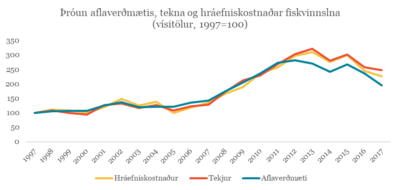 Hlutfall kostnaðar vegna aðfanga er nokkuð áþekkt frá einum tíma til annars. Hráefni sem hlutfall af heildar aðfangakostnaði var alla jafna á bilinu 70-80% á tímabilinu 1997-2017. Aðrir einstakir kostnaðarliðir vega ekki þungt. Sumum hættir til að álykta á þá leið, að þróun hráefniskostnaðar hafi úrslitaáhrif á rekstrarafkomu og hagkvæmni í vinnslu. Þetta kann að vera rétt fyrir einstaka fyrirtæki og fer eftir því hversu greiðan aðgang það hefur að hráefni. Hins vegar er þetta ekki alls kostar rétt fyrir atvinnugreinina í heild, enda fylgjast hráefniskostnaður og aflaverðmæti að og þar af leiðandi einnig tekjur. Til að glöggva sig á þessu má hér að neðan sjá þróun þessara stærða frá árinu 1997.