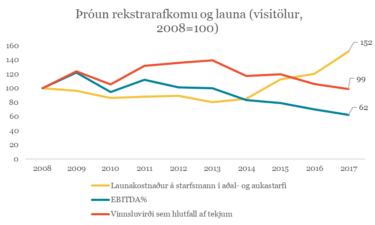 Af fyrrgreindu má vera ljóst að það er ekki breyting á hráefniskostnaði sem dregið hefur úr rekstrarhagkvæmni og framlegð á undanförnum árum. Það er í raun hægt að álykta að það sé ekkert í aðfangakostnaðinum sem hefur drifið þetta áfram, enda var vinnsluvirði ( sem eru tekjur að frádregnum aðfangakostnaði), jafn hátt hlutfall af tekjum árið 2017 og það var árið 2008. Til þess að meta rekstrarafkomu þarf að draga laun og tengd gjöld, ásamt sköttum á framleiðslu (sem eru óverulegur hluti af heildinni), frá vinnsluvirði. Við nánari skoðun virðist sem þar liggi hundurinn grafinn.