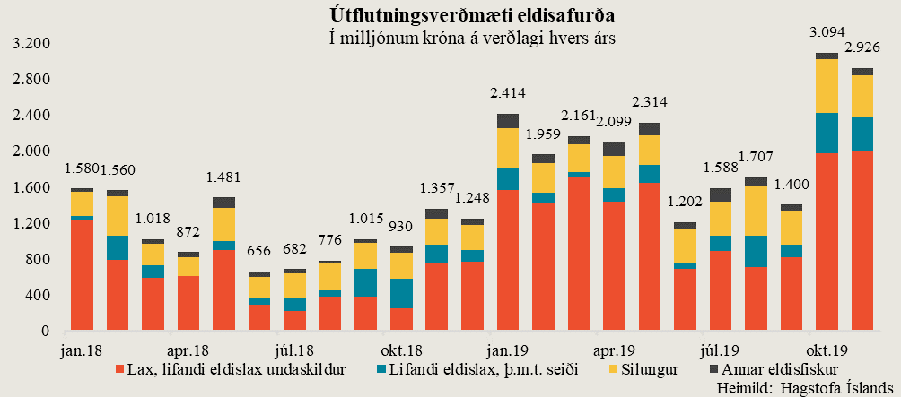 Alls var fluttur út eldislax fyrir um 2,4 milljarða króna í nóvember, sem er um 151% aukning frá nóvember árið 2018. Þar af nam útflutningsverðmæti lifandi eldislax, þar með talið seiði, 387 milljónum króna en slíkur útflutningur hefur aukist verulega að undanförnu. Ætla má að þar sé um frjóvguð hrogn að ræða, sem er afar verðmæt framleiðsla enda hátækniafurð. Útflutningsverðmæti silungs nam 461 milljón króna í nóvember og jókst um tæp 60% frá sama mánuði 2018.