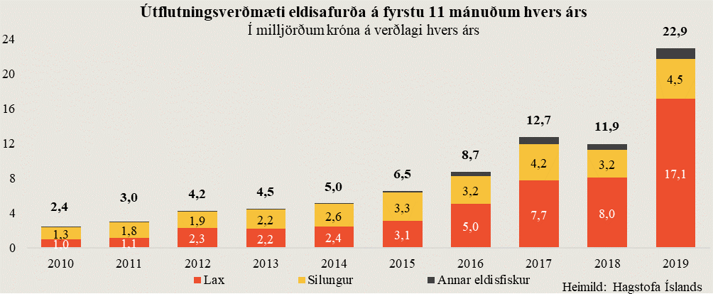 Á fyrstu 11 mánuðum nýliðins árs er útflutningsverðmæti eldisafurða komið upp í rúma 22,9 milljarða króna. Það er um 92% aukning í krónum talið á milli ára en um 72% að teknu tilliti til gengisáhrifa. Það er stóraukin framleiðsla sem skýrir þessa aukningu, sér í lagi á eldislaxi. Í upphafi árs höfðum við gert ráð fyrir að útflutningsverðmæti eldisafurða yrði í kringum 24 milljarða króna í ár. Líkur er á að það verði nærri lagi, en miðað við þróunina er líklegt að útflutningsverðmæti eldisafurða verði í kringum 25 milljarða í ár.