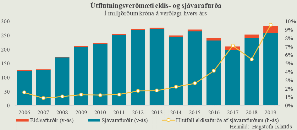 Útflutningsverðmæti eldisafurða var um 10% af verðmæti sjávarafurða á árinu 2019 og hefur þetta hlutfall aldrei verið hærra. Ekki er við öðru að búast en hlutfallið hækki enn frekar á næstu árum samfara aukinni framleiðslu og þar með útflutningi, enda eru þar veruleg tækifæri til verðmætasköpunar.  Ítarlegri umfjöllun um þetta má sjá á Radarnum, en þar hafa tölur sem og umfjöllun verið uppfærð.