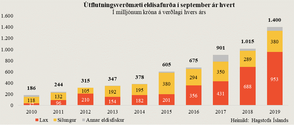 Útflutningsverðmæti eldisafurða nam 1.400 milljónum króna í september samkvæmt tölum sem Hagstofan birti í morgun. Þetta er nokkuð hægari aukning en verið hefur það sem af er ári en engu að síður veruleg, eða um 38% á milli ára og hefur útflutningsverðmæti eldisafurða aldrei áður verið meira í septembermánuði. Gengi krónunnar var að jafnaði ríflega 7% veikara í september síðastliðnum en í sama mánuði í fyrra miðað við gengisvísitölu krónunnar. Er því um að ræða 28% aukningu í verðmætum í erlendri mynt.