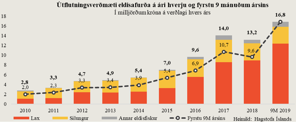 Á fyrstu 9 mánuðum ársins nemur útflutningsverðmæti eldisafurða rúmlega 16,8 milljörðum króna. Á sama tímabili í fyrra var útflutningsverðmæti eldisafurða komið upp í rúma 9,6 milljarða króna og nemur aukningin í krónum talið á milli ára 75%. Að teknu tilliti til gengisáhrifa nemur aukningin rúmlega 56% en gengi krónunnar var að jafnaði 10% veikara á fyrstu 9 mánuðum ársins en á sama tímabil í fyrra. Það er stóraukin framleiðsla á eldislaxi sem skýrir þessa aukningu og er útflutningsverðmæti lax 90% meira á fyrstu 9 mánuðum ársins miðað við sama tímabil í fyrra. Á myndinni hér fyrir neðan má jafnframt sjá að útflutningsverðmæti eldisafurða er nú þegar orðið 20% meira en það hefur mest farið upp í á heilu ári sem var árið 2017.