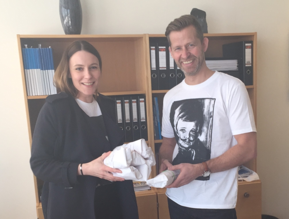 Sigrún Edda Eðvarðsdóttir, verkefnastjóri tískufyrirtæksins Eyland, kom færandi hendi á skrifstofu Samtaka fyrirtækja í sjávarútvegi í morgun, með ljómandi fallega boli. Eins og sjá má á meðfylgjandi mynd beið Kolbeinn Árnason, framkvæmdastjóri samtakanna, ekki boðanna heldur brá sér í einn í snarhasti.