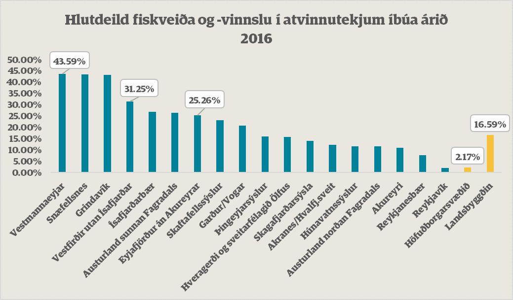 Samkvæmt gögnum Byggðastofnunar um uppruna tekna má sjá, að 2,2% tekna íbúa á höfuðborgarsvæðinu má rekja til sjávarútvegs. Ef litið er til annarra landshluta er staðan önnur. Á Vestfjörðum standa fiskveiðar og fiskvinnsla undir hátt í þriðjungi af atvinnutekjum. Vægi sjávarútvegs er raunar meira en 10% alls staðar nema á höfuðborgarsvæðinu. Þegar litið er til einstakra sveitarfélag er hlutfallið hæst í Vestmannaeyjum, 43,6%, og svipað á Snæfellsnesi og í Grindavík. Meðaltalið á landsbyggðinni er 16,6%, eða næstum því átta sinnum hærra en það er á höfuðborgarsvæðinu.