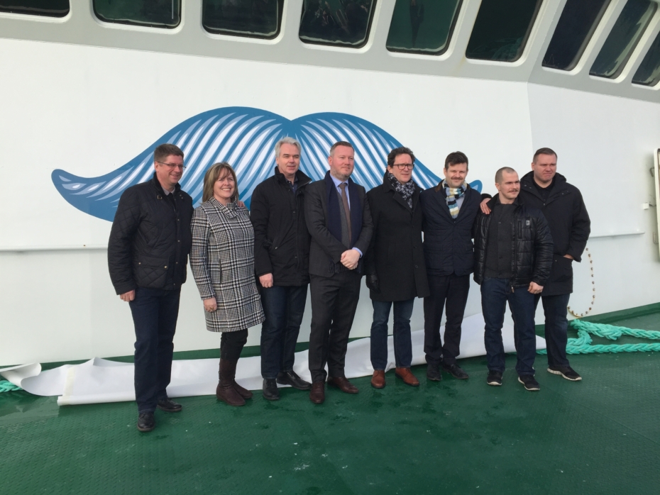 Frá vinstri: Heimir Guðbjörnsson, skipstjóri á Helgu Maríu frá HB Granda, Ragnheiður Haraldsdóttir, forstjóri Krabbameinsfélagsins, Jakob Jóhannsson, formaður Krabbameinsfélagsins, Jens Garðar Helgason, formaður Samtaka fyrirtækja í sjávarútvegi, Kristján Þór Júlíusson heilbrigðisráðherra, Haukur Þór Hauksson, aðstoðarframkvæmdastjóri Samtaka fyrirtækja í sjávarútvegi, Sigurgeir Freyr Pálmason, háseti á Helgu Maríu, og Loftur Gíslason, útgerðarstjóri ísfisksskipa HB Granda, afhjúpa fyrstu mottur marsmánaðar.