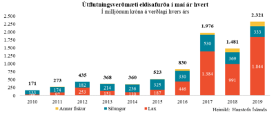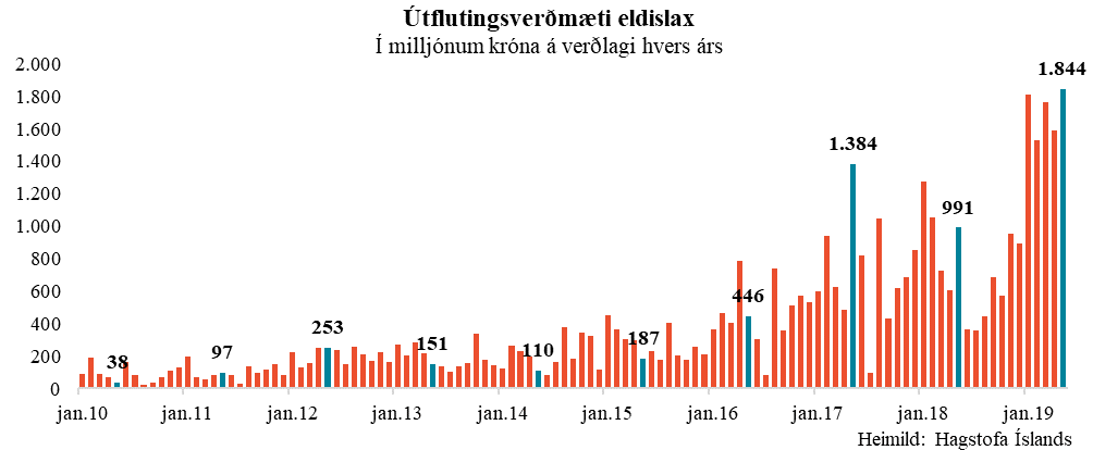Útflutningsverðmæti eldislax nam 1.844 milljónum króna í maí og hefur aldrei verið hærra. Í maí í fyrra var það 991 milljón og er þetta því aukning upp á 86% í krónum talið, en um 65% sé tekið tillit til gengisáhrifa. Var því lítilsháttar samdráttur á útflutningsverðmæti annarra eldisafurða, eða sem nemur tæplega 3% í krónum talið á milli ára, sem einkum má rekja til útflutningsverðmæti silungs. Útflutningsverðmæti silungs nam 333 milljónum króna, sem er tæplega 10% samdráttur í krónum talið miðað við maí í fyrra.