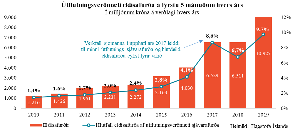 Á fyrstu fimm mánuðum ársins er útflutningsverðmæti eldisafurða komið upp í rúma 10,9 milljarða króna. Það er 68% aukning í krónum talið á milli ára, en á sama tímabili í fyrra var verðmæti eldisafurða 6,5 milljarðar króna. Útflutningsverðmæti eldisins er rétt tæplega 10% af útflutningsverðmæti sjávarafurða á tímabilinu og hefur hlutfallið aldrei mælst hærra á tímabilinu, eins og myndin hér fyrir neðan ber með sér.