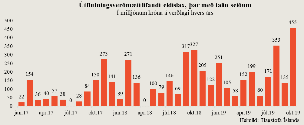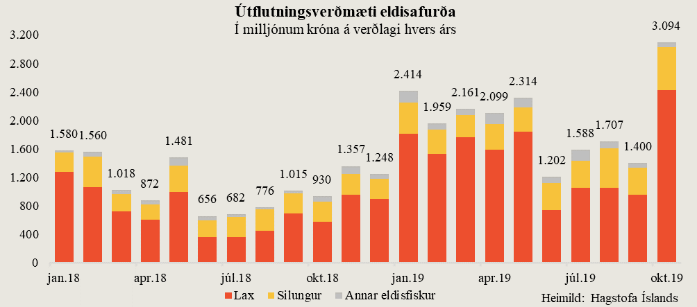Útflutningsverðmæti eldisafurða nam um 3,1 milljarði króna í október og hefur aldrei áður verið meira í einum mánuði. Það er vel yfir þreföldun í verðmætum miðað við sama mánuð í fyrra, bæði í krónum talið sem og í erlendri mynt. Gengi krónunnar var að jafnaði um 3% veikara í október síðastliðnum en í sama mánuði í fyrra miðað við gengisvísitölu.Var því minni munur á genginu á milli ára en verið hefur á öðrum mánuðum ársins enda veiktist gengið nokkuð hressilega á haustmánuðum 2018. Þetta má sjá í tölum sem Hagstofa Íslands birti í morgun.