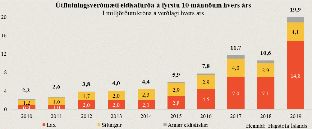 Á fyrstu 10 mánuðum ársins er útflutningsverðmæti eldisafurða komið upp í rúma 19,9 milljarða króna. Það er um 90% aukning í krónum talið á milli ára en rúm 70% að teknu tilliti til gengisáhrifa. Gengi krónunnar var að jafnaði 10% veikara á fyrstu 10 mánuðum ársins en á sama tímabili í fyrra. Er það stóraukin framleiðsla sem skýrir þessa aukningu, sér í lagi á eldislaxi. Þar af nam verðmæti lifandi eldislax, þar með talið seiði, rúmlega 1,9 milljarði króna á tímabilinu samanborið við tæpa 1,5 milljarð á sama tímabili í fyrra. Er aukning þar hátt í 30% á milli ára. Rímar þessi þróun afar vel við spá okkar um að verðmæti eldisafurða verði í kringum 24 milljarða króna í ár.