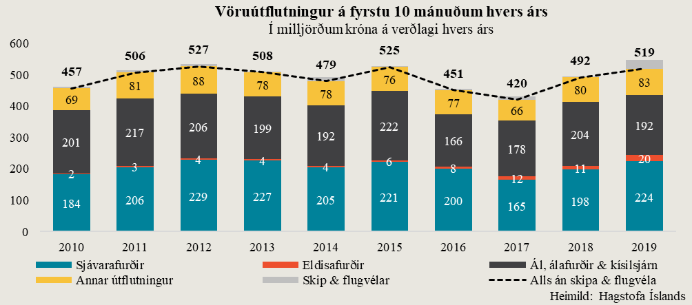 Öflugur og fjölbreyttur útflutningur er grundvallarforsenda þess að við getum búið við þau lífsgæði sem við kjósum okkur. Er því óhætt að segja að ofangreind þróun sé kærkomin búbót við útflutningstölur þjóðarbúsins, sem í heild eru ekki upp á marga fiska í ár. Þannig hafa verið fluttar út vörur fyrir rúma 543 milljarða króna í ár, 51 milljarði króna meira en á sama tímabili í fyrra. Þar af skýrir útflutningur skipa og flugvéla rúma 24 milljarða, en nettó áhrifin af slíkum útflutningi eru engin á þjóðarhag, þar sem á móti auknum útflutningi kemur það sem samdráttur í fjárfestingu í þjóðhagsreikningum. Þannig að án skipa og flugvéla og að teknu tilliti til gengislækkunar krónunnar, dregst vöruútflutningur saman um tæp 5% milli ára. Þar að auki hefur verið talsverður vöxtur í útflutningi hátæknibúnaðs fyrir sjávarútveg og matvælaframleiðslu undanfarið, en erfitt er að festa hendi á nákvæma fjárhæð í þeim efnum þar sem hún kemur fyrir í allmörgum liðum í útflutningstölunum. Seðlabankinn gefur þessum lið einmitt gaum í síðustu spá sinni, auk eldisafurðanna, og reiknar með talsverðum vexti sem mun vega eitthvað upp á móti þeim samdrætti sem á sér stað í flestum öðrum liðum útflutnings.