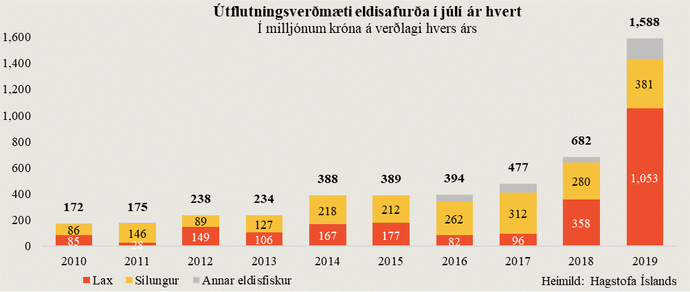 Útflutningsverðmæti eldisafurða nam um 1.590 milljónum króna í júlí samkvæmt tölum sem Hagstofan birti í morgun. Þetta er veruleg aukning á milli ára, eða sem nemur 133% og hefur útflutningsverðmæti eldisafurða aldrei áður verið meira í júlímánuði. Gengi krónunnar var tæplega 12% veikara í júlí en í sama mánuði í fyrra og því um að ræða ríflega tvöföldun í verðmætum í erlendri mynt. Í tonnum talið jókst útflutningur eldisafurða um 168%, en alls voru flutt út ríflega 1.520 tonn af eldisafurðum í júlí samanborið við um 570 tonn í sama mánuði í fyrra.