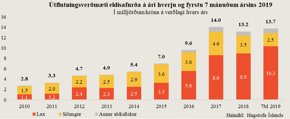 Á fyrstu 7 mánuðum ársins nemur útflutningsverðmæti eldisafurða rúmum 13,7 milljörðum króna. Það er um 75% aukning í krónum talið á milli ára, en á sama tímabili í fyrra var verðmæti eldisafurða rúmir 7,8 milljarðar króna. Að teknu tilliti til gengisáhrifa nemur aukningin 56% og er nokkuð ljóst að það er stóraukin framleiðsla á eldislaxi sem skýrir þessa aukningu. Á myndinni hér fyrir neðan má jafnframt sjá að útflutningsverðmæti eldisafurða er nú þegar orðið nokkuð meira en það var allt árið í fyrra. Ef síðustu 5 mánuðir ársins verða í takti við fyrstu 7 mánuðina verður útflutningsverðmæti eldisafurða í ár um 24 milljarðar króna.
