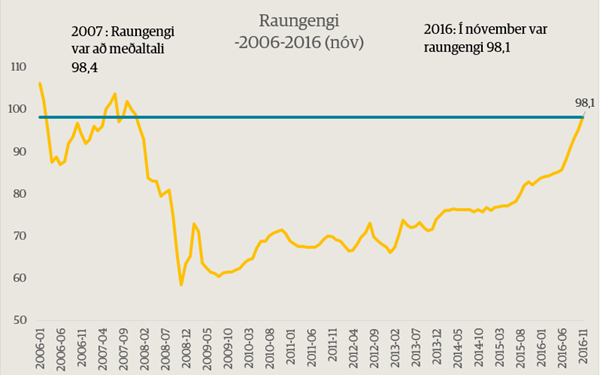 Íslenska hagkerfið er lítið og háð útflutningi. Eðli máls samkvæmt hefur gengisþróun því áhrif á fyrirtæki í útflutningi. Fyrirtæki sem að selja vörur nánast eingöngu á erlenda markaði, og þar af leiðandi fá greitt fyrir vörur í erlendum gjaldmiðlum, verða fyrir breytingum í rekstri eftir því sem gengið breytist. Ógleymanlega féll íslenska krónan í lok árs 2008 og allt hagkerfið varð fyrir verulegri röskun. Skilyrði til útflutnings urðu hins vegar verulega betri. Nú er staðan önnur. Frá byrjun árs 2014 hefur gengið verið í samfelldu styrkingarferli og raungengi er komið á sama stað og það var árið 2007, líkt og greina má af neðangreindri mynd.