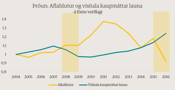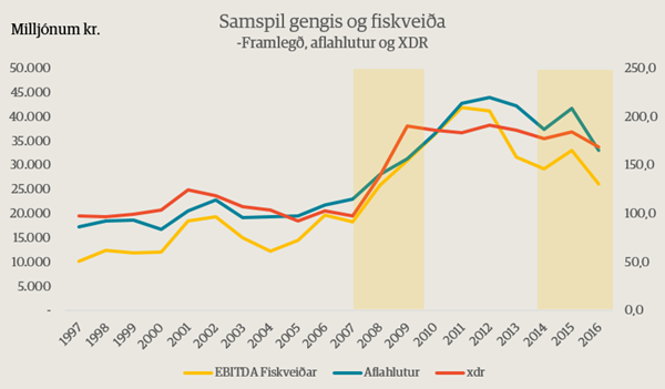 Á ofangreindri mynd má á hægri ás sjá þróun XDR, þ.e. samsetningu erlendra gjaldmiðla sem stunduð eru viðskipti með. Á vinstri ás má sjá þróun á aflahlut sjómanna og framlegð í fiskveiðum. Líkt og greina má þá þróast aflahlutur og framlegð í takt við gengið. Þegar gengið er veikt þá er hærri framlegð og stærri aflahlutur en þegar gengið er sterkt þá er farið öfuga leið. Frá 2011-2015 hafa skilyrði í sjávarútvegi verið hagstæð, verð á sjávarafurðum hefur verið hátt og gengið var hagstætt til útflutnings. Bæði fyrirtæki og sjómenn hafa notið góðs af þeirri þróun. En eins og áður hefur verið bent á, þá hefur orðið veruleg styrking á gengi íslensku krónunnar og skilyrði til útflutnings eru nú sambærileg þeim sem voru árið 2007. Það veldur áhyggjum þar sem tekjur fyrirtækja og verðmæti hlutar sjómanna dragast saman. Ekkert bendir til þess að þróun þessi sé að breytast, heldur mun krónan enn styrkjast árið 2017 samkvæmt spá Seðlabankans.