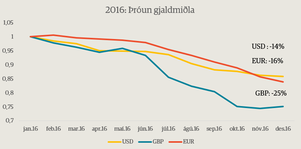 Sjávarútvegur framleiðir fiskafurðir sem rata nánast alfarið á erlenda markaði. Tekjur sjávarútvegsins eru því nær eingöngu í erlendum gjaldmiðlum. Líkt og áður hefur verið bent á þá hefur gengið áhrif á tekjur sjávarútvegsins vegna þess að þær eru til útflutnings. Þróunin helstu gjaldmiðla á stærstu markaði fyrir sjávarafurði hefur þróast á einn veg það sem af er þessu ári, sbr. ofangreinda mynd, og það til verri vegar fyrir fyrirtæki í útflutningi. Gengi Bandaríkjadollars gagnvart íslensku krónunni hefur fallið um 14% frá byrjun árs til dagsins í dag. Bandaríkjamarkaður er stór markaður, en gjaldmiðillinn er einnig leiðandi mynt í heiminum. Viðskipti með dollara eiga sér t.a.m. stað á öðrum stórum mörkuðum. Má þar m.a. nefna Nígeríu og Austur-Evrópu. Gengi Evru hefur þróast í sömu átt en Evrusvæðið er stærsta markaðsvæði íslenskra sjávarafurða og stærsti einstaki markaðurinn fyrir íslenskar sjávarafurðir er Bretlandsmarkaður. Pundið hefur fallið gagnavart helstu myntum í heiminum frá því Bretland tók ákvörðun um útgöngu úr Evrópusambandinu. Á sama tíma hefur íslenska krónan styrkst. Því hefur pundið fallið um 25% gangvart íslensku krónunni á þessu ári. Þessi þróun hefur veruleg áhrif á tekjur í sjávarútvegi.