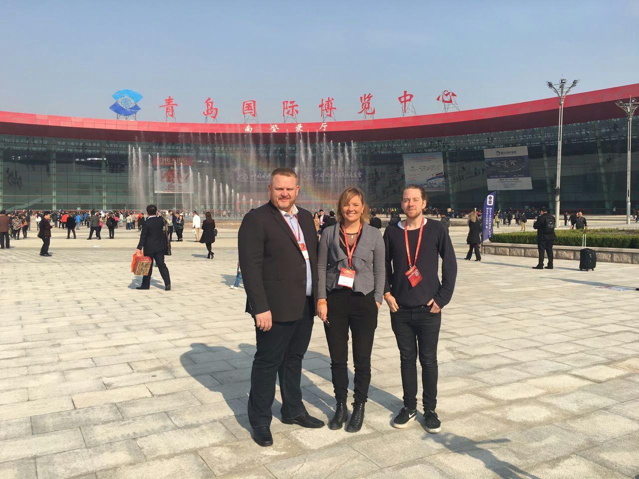 Á myndinni eru: Hörður Sævaldsson, sjávartúvegsfræðingur og lektor HA, Hilda Jana Gísladóttir umsjónamaður þáttaraðarinnar og Elvar Örn Egilsson kvikmyndagerðarmaður. Myndin er tekin á einni stærstu sjávarútvegssýningu heims í Qingdao í Kína.