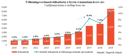 Á fyrstu fjórum mánuðum ársins er útflutningsverðmæti afurða frá fiskeldi komið í 8,6 milljarða króna. Þetta er mikil aukning frá því sem verið hefur undanfarin ár. Til dæmis er þetta hærri fjárhæð en sem nemur útflutningsverðmæti eldisafurða á öllu árinu 2015 og árin þar á undan. Aukningin á fyrstu fjórum mánuðum ársins í krónum talið, miðað við fyrstu fjóra mánuði fyrra árs, nemur 71%. Á fyrstu fjórum mánuðum ársins 2018 nam útflutningurinn rétt rúmum 5 milljörðum króna, en er eins og áður segir, nú kominn í 8,6 milljarða. Sem hlutfall af heildar útflutningsverðmæti sjávarafurða frá Íslandi eru þetta ríflega 10% og hlutfallið hefur aldrei mælst hærra. Fari svo fram sem horfir má gera ráð fyrir að verðmæti útfluttra afurða frá fiskeldi verði í kringum 25 milljarðar króna á þessu ári.